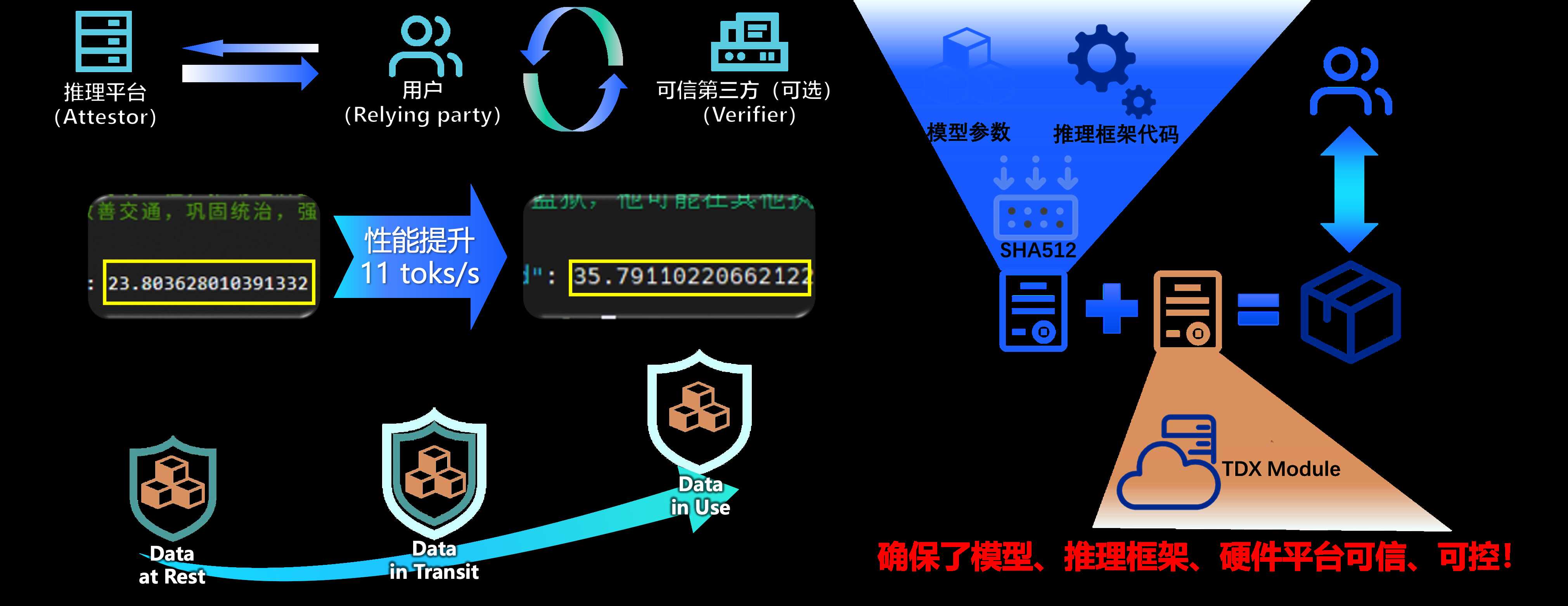 MortarTEE是基于机密虚拟机技术的大模型隐私推理系统,包括远程证明技术、推理加速技术和全链路模型加密技术。系统通过远程证明对模型数据、推理框架代码和硬件固件版本进行认证,保证了可信、可控、可证的大模型推理系统;通过充分利用多核并行和向量指令集加速,系统提高了在机密虚拟机中的大模型推理效率;通过对静态、动态的数据进行全链路的加密保护,对用户数据和和模型参数同时保护,系统达到了全链、全程、全域的数据保护。本方案通过结合多种隐私保护技术和计算加速技术,在机密虚拟机中部署了高效的大模型隐私推理服务,未来可向多虚拟机协同、多机密硬件加速器协作等方向发展。