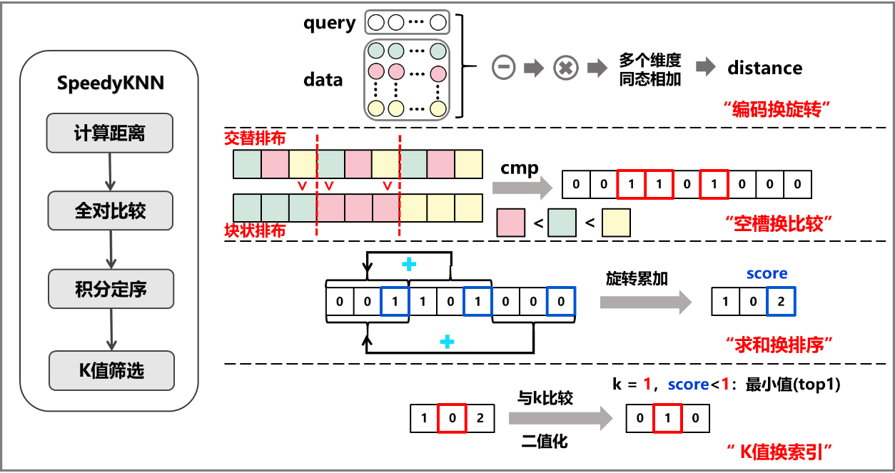 SpeedyKNN是基于团队自研Poseidon计算库的快速密态K近邻算法,以轻量化、灵活性高和全栈自研为特点。在传统基于同态排序的密态KNN方案中,由于在密态下进行频繁的数据两两之间的比较以及交换操作,需要较大的乘法电路深度,因此会引入高昂的自举开销造成极低的计算效率。SpeedyKNN通过“编码换旋转”、“空槽换比较”、“求和换排序”和“K值换索引”四大核心思想降低KNN中每个步骤的计算开销,使得算法在距离计算时无需同态旋转、在全对比较时仅需一次同态比较操作、在积分定序时仅需简单求和、在K值筛选时能够零开销自由切换K值。多种优化策略使得SpeedyKNN相较于传统密态KNN算法具有无需自举、旋转数量少、存储需求低、密文槽利用率高等诸多优势,多维度地提升了算法效率,为密态KNN在实际场景中的应用提供了高效的解决方案。