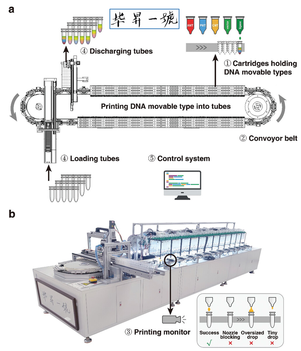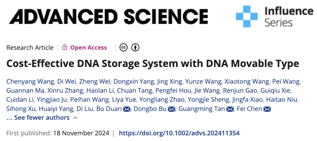 2024 年 11 月 18 日,中国科学院北京基因组研究所(国家生物信息中心)陈非团队、计算所处理器芯片全国重点实验室卜东波、谭光明团队、中科计算技术西部研究院段勃团队、微生物所杨怀义团队、武汉所刘翟团队以及吉林大学李全顺团队等在知名国际学术期刊《Advanced Science》上发表了题为 “Cost-Effective DNA Storage System with DNA Movable Type” 的论文,借鉴毕昇活字印刷术的思想,提出了“DNA活字存储”新思路,并实现了具有完全自主知识产权的全自动、低成本、高效率的DNA 活字存储喷墨打印机“毕昇一号”。