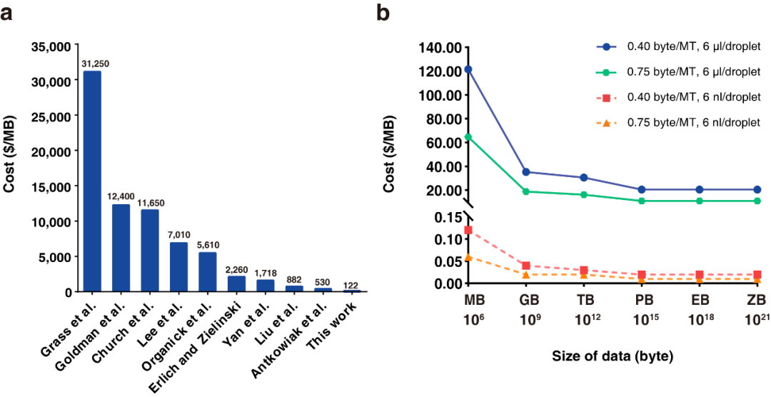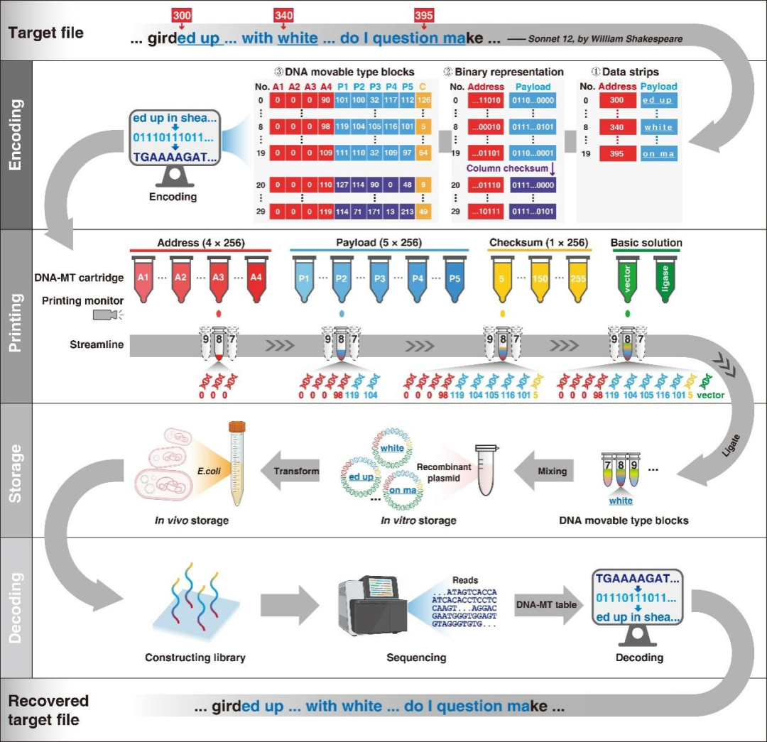鉴于 DNA 存储技术的巨大潜力,美国微软公司陆续投资近亿美元,与华盛顿大学于 2015 年成立 DNA 存储项目组,于 2018 年 3 月完成了约 200MB 数据的保存,其中包括古登堡计划数据库中的 100 部世界名著,创造了 DNA 存储领域的新纪录。2019 年,他们构建了端到端全流程原型机,实现了 “hello” 单词的完整写读。现有的 DNA 存储技术 “一次合成、一次使用”,价格昂贵,怎样才能降低成本?用 DNA 活字吧!DNA 活字存储是一种有潜力的方案!“庆历中,有布衣毕昇,又为活板。其法:用胶泥刻字,薄如钱唇,每字为一印,火烧令坚…… 欲印,则以一铁范置铁板上,乃密布字印,满铁范为一板,持就火炀之,药稍镕,则以一平板按其面,则字平如砥。若止印三二本,未为简易;若印数十百千本,则极为神速”。这是沈括写的《活板》中的一段话 ---《活板》被选作初中课文,是以举凡在中国读过初中者,想必对毕昇发明活字印刷术的故事皆耳熟能详。《活板》有言:“有奇字素无备者,旋刻之,以草火烧,瞬息可成”,活字印刷术相较于雕版印刷术之优势可见一斑。那什么是 DNA 活字存储呢?所谓 DNA 活字存储,就是 “DNA 版本的活字印刷术”。目前的 DNA 存储技术方案,多采用化学合成法,一次合成,一次使用,可比作雕版印刷术;而 DNA 活字能够一次合成,多次使用,可比作活字印刷术。具体来说,DNA 活字存储采用酶连反应替代部分化学合成步骤完成数据写入,每个活字可重复使用多达一万次,从而将数据存储成本降低至每兆字节仅 122 美元,成为当前业内最具成本效益的存储解决方案。图 2. 毕昇发明的活字印刷术与 DNA 活字存储。以唐诗《行路难・其一》为例,我们将每个字符及其位置索引转换成 DNA 活字,用酶联技术连接成 DNA 片段,最终转导入大肠杆菌中长期存储3. “毕昇一号”--- 全自动的 DNA 活字存储喷墨打印机DNA 活字存储包括选活字、酶联活字、酶联后的 DNA 片段转导入大肠杆菌中长期存储等多个环节。如何提高存储效率呢?联合团队研发了 DNA 活字喷墨打印机 “毕昇一号”,全自动完成上述诸多环节,显著提升了数据写入效率 --- 研究团队将这台打印机命名为 “毕昇一号”,以表达对毕昇的崇敬之意。图 3. “毕昇一号”--- 全自动的 DNA 活字存储喷墨打印机 “毕昇一号” 系统使用 350 个 DNA 活字,成功存储并精准检索了 43.7 KB 的多媒体数据,包括文本、图像、音频和视频,充分证明了其技术的可行性和应用潜力。这项工作为 DNA 数据存储技术的未来产业化提供了全新的思路与可能性。毕昇一号 DNA 活字存储系统的工作流程包括四个主要步骤:第一步,编码:将目标文件(如《十四行诗》第 12 首)分割为 100 字节 / 字符的片段,每个片段进一步划分为 20 个数据切片。每个切片包含 5 字节的有效载荷和 4 字节的地址,形成数据条带。例如,图中展示了第四条数据条带的 20 个连续数据切片(第 0–19 行),这些切片覆盖了第 300 到第 399 个字符的内容(如 “ed up标点符号重复!question ma”),其中第 8 个切片在第 340 个位置编码了单词 “white”。此外,通过列校验和(第 20–29 行)和行校验和(第 9 列)提供了额外的错误检测和纠正功能。第二步,打印:利用 “毕昇一号” DNA-MT 喷墨打印机,将 4 个地址活字(AMTs)、5 个有效载荷活字(PMTs)和 1 个校验活字(CMT),以及连接酶和预切割载体打印到每个试管中,通过酶促连接形成包含 DNA-MT 块的质粒。第三步,存储:组装完成的重组质粒可以以液体或冻干形式进行体外保存,或者转化至大肠杆菌中实现长期体内存储。第四步,解码:通过高通量测序对 DNA 活字块进行测序,获得的 DNA 序列根据编码表解码为对应活字,从而还原原始数据。例如,解码一个 250 个碱基的序列可以恢复第 340 个位置的单词 “white”。最终,解码后的有效载荷活字根据地址活字的顺序排列,完成对原始文件的重建。图 4. 毕昇一号 DNA 活字存储系统的工作流程毕昇一号 DNA 活字存储的成本约为 122 $/MB,明显低于现有的 DNA 存储技术。该团队表示,后续研究通过增加活字连接段数和减小反应体系,可将存储成本降低至 0.06 $/MB,伴随着编码技术的进步,如集成高密度喷泉码和改进校验的 DNA 活字,成本将进一步降低,有望进一步推动 DNA 存储的商业化进程。DNA 存储技术是生物技术与信息处理技术的碰撞与交叉。它开辟了一种新的存储模式,从根本上改变了数据、信息的保存及传递方式,是大数据存储模式的新篇章。北宋时,毕昇发明了活字印刷术,尽扫雕版印刷术之弊;而时至今日,古老的活字印刷术与现代的 DNA 存储相互激发,相互交叉,碰撞出 “DNA 活字存储” 这一新思维。