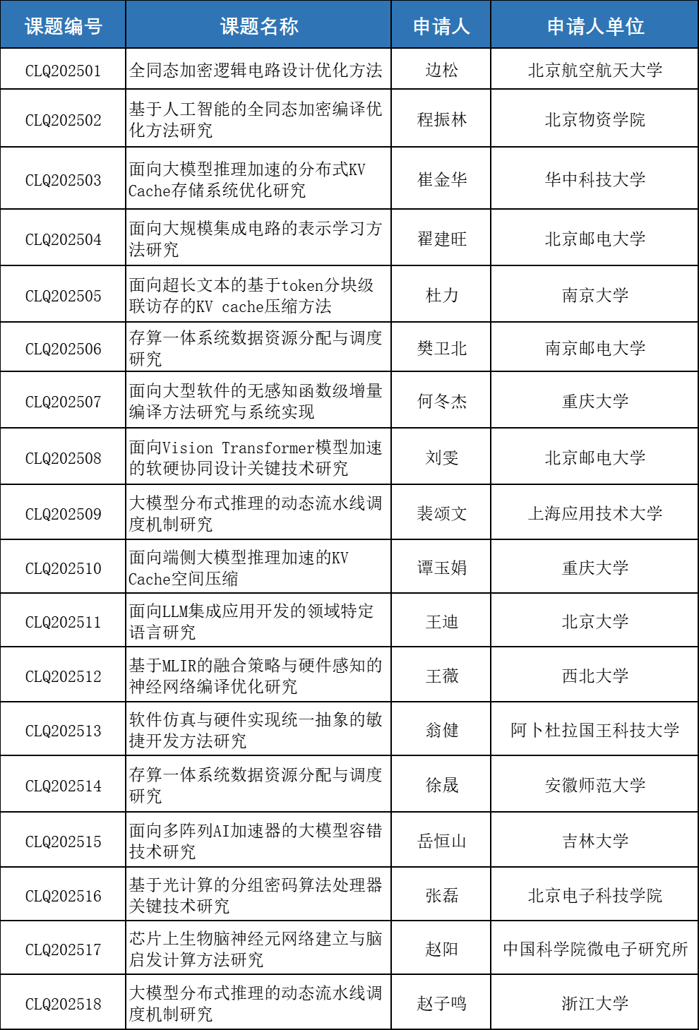 自2025年7月实验室发布《处理器芯片全国重点实验室2025年度开放课题申请指南》以来,得到了来自全国各科研院所、高等院校的广泛关注和踊跃申报。经实验室组织专家评审,结合申请书和实验室研究方向的契合度等因素,本着公平公正、择优支持的原则,决定对以下18项课题予以立项资助,每项10万元,执行周期为两年(2025.9.30-2027.9.30)。恭喜以下申请者!